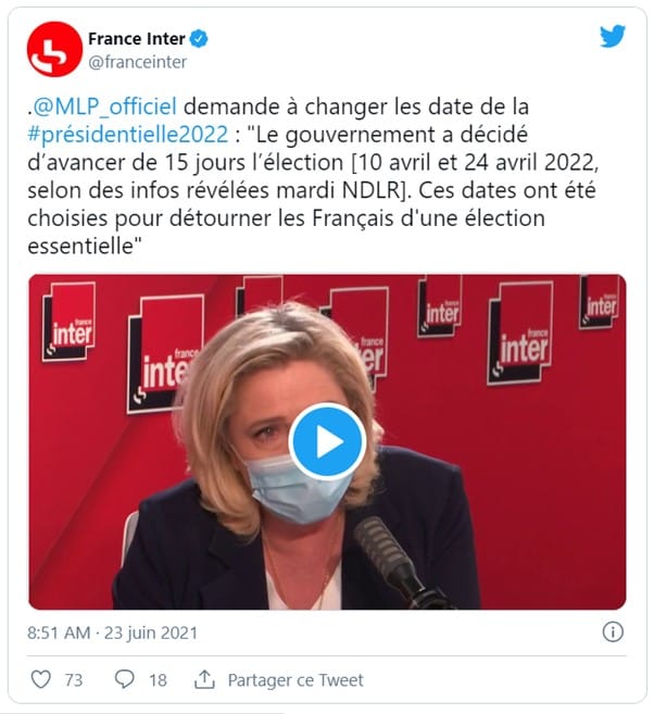 “On met le premier tour le jour où la région PACA et les Hauts-de-France sont en vacances. Pour le deuxième tour, tout le monde sera en vacances… [NDLR : le 10 avril, la zone B puis le 24 avril, les zones A et C seront en vacances] Est-ce que vous croyez très honnêtement que c’est susceptible de motiver les électeurs, que de positionner le second tour de l’élection présidentielle à un moment où tout le monde est en vacances ?“ demande Marine Le Pen, mercredi 23 juin sur France Inter. Selon la présidente du R.N., le gouvernement joue l’abstention : “Je pense qu’il faut changer ces dates. Elles ont été choisies pour détourner les Français d’une élection essentielle.“