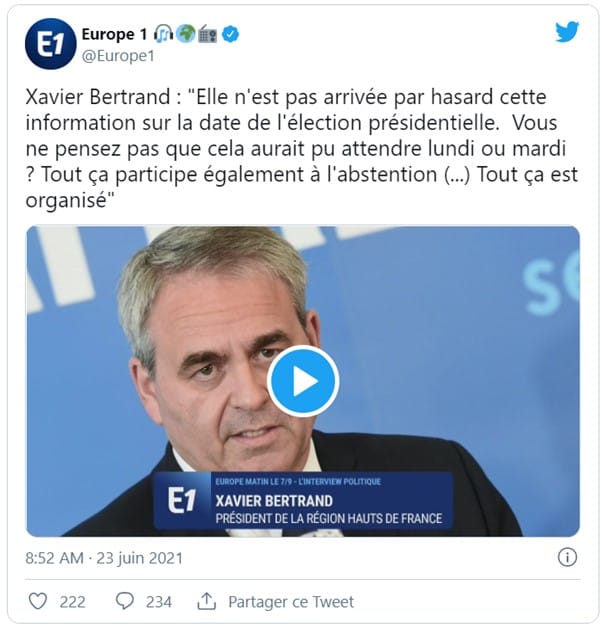 Xavier Bertrand, candidat à l’élection présidentielle, critique lui aussi cette annonce dans laquelle il voit un coup orchestré pour détourner les électeurs du second tour des régionales. “Elle n’est pas arrivée par hasard cette information sur la date de l’élection présidentielle, déclare-t-il sur Europe1. Vous ne pensez pas que ça aurait pu attendre lundi ou mardi ? Tout ça participe à l’abstention. On nous dit que le second tour des régionales, ce n’est pas si important que ça puisque la présidentielle est presque déjà là. (…) Dans la vie politique, je ne crois absolument pas aux coïncidences.“