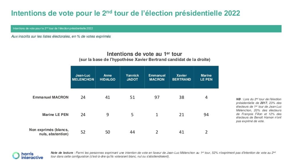 Si, malgré ses faibles réserves de voix, Marine Le Pen atteint 47% des intentions de vote, c’est parce qu’Emmanuel Macron est lui aussi l’objet de mauvais reports de voix. Le même sondage Harris Interactive donne les chiffres suivants: 24% de reports des électeurs de Mélenchon, 41% d’Anne Hidalgo, 51% de Jadot et 38% de Bertrand.