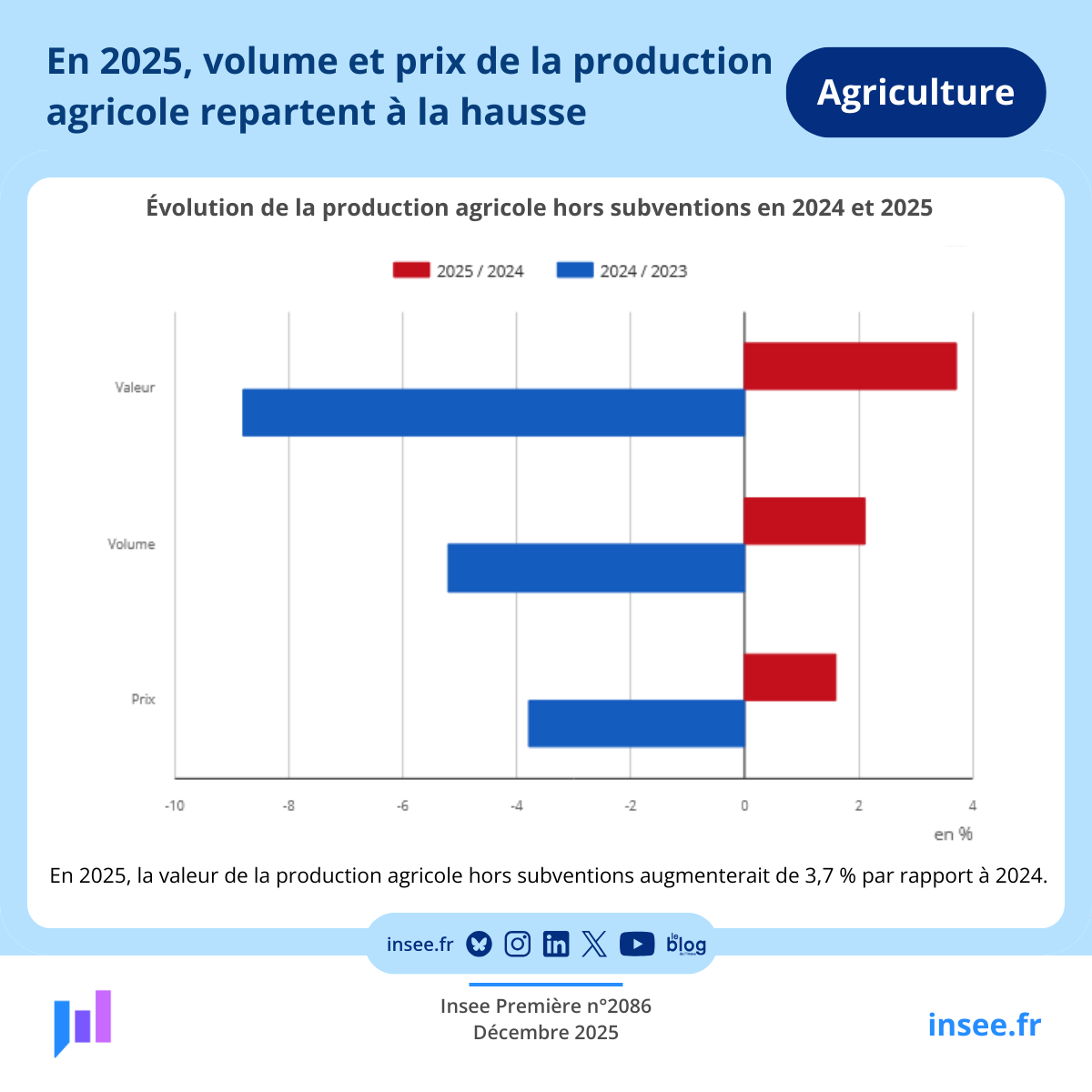 Alors que la colère agricole gronde contre le Mercosur et la gestion sanitaire de l’État, les chiffres de l’Insee racontent une autre histoire : en 2025, la production agricole française rebondit nettement, portée avant tout par l’élevage et la dynamique des prix.