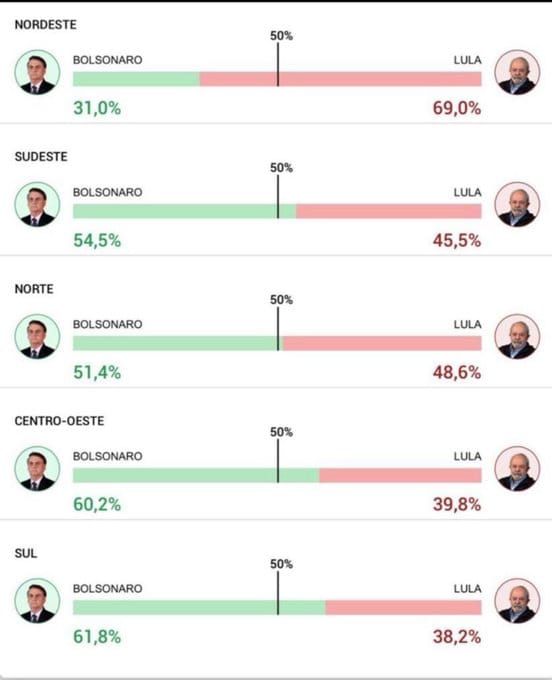 4. Le pays est électoralement toujours coupé en deux, comme depuis que mon arrivée en 2009. Les régions les plus pauvres, comme le Nordeste, votent Lula, les plus riches et les plus agricoles Bolsonaro. Minas Gerais comme toujours est un mini Brésil et décidera de l’élection.