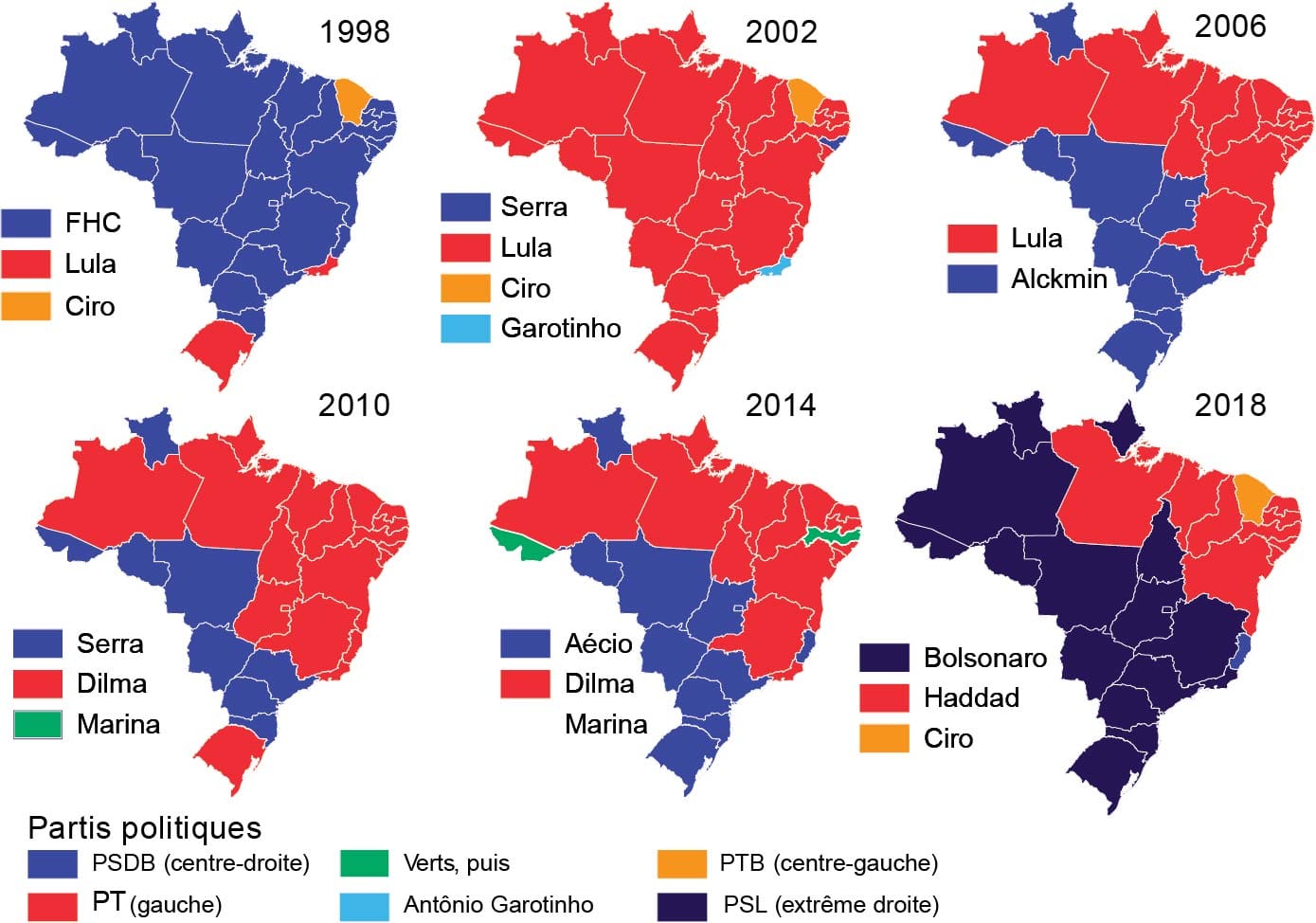 La cartographie des scrutins présidentiels depuis la fin des années 1990, montre la polarisation croissante de la société brésilienne: