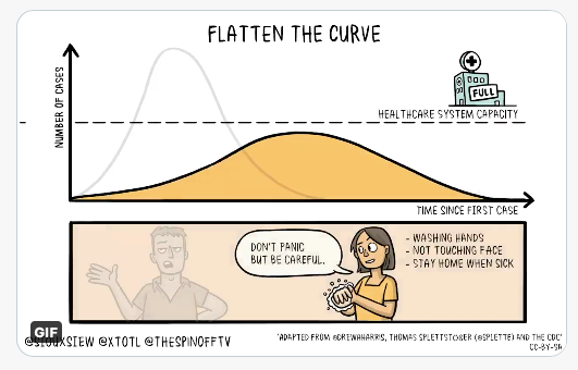 En soi, le confinement ne soigne pas. Dans les deux cas le nombre de contaminés ne change pas vraiment. Toutefois, le confinement peut être utile s’il permet de prendre en charge plus tard des gens qui n’auraient pas pu être soignés s’ils avaient été contaminés plus tôt. C’est ce qu’illustre la ligne horizontale de capacité du système de soin. Le même raisonnement s’applique au couvre-feu.