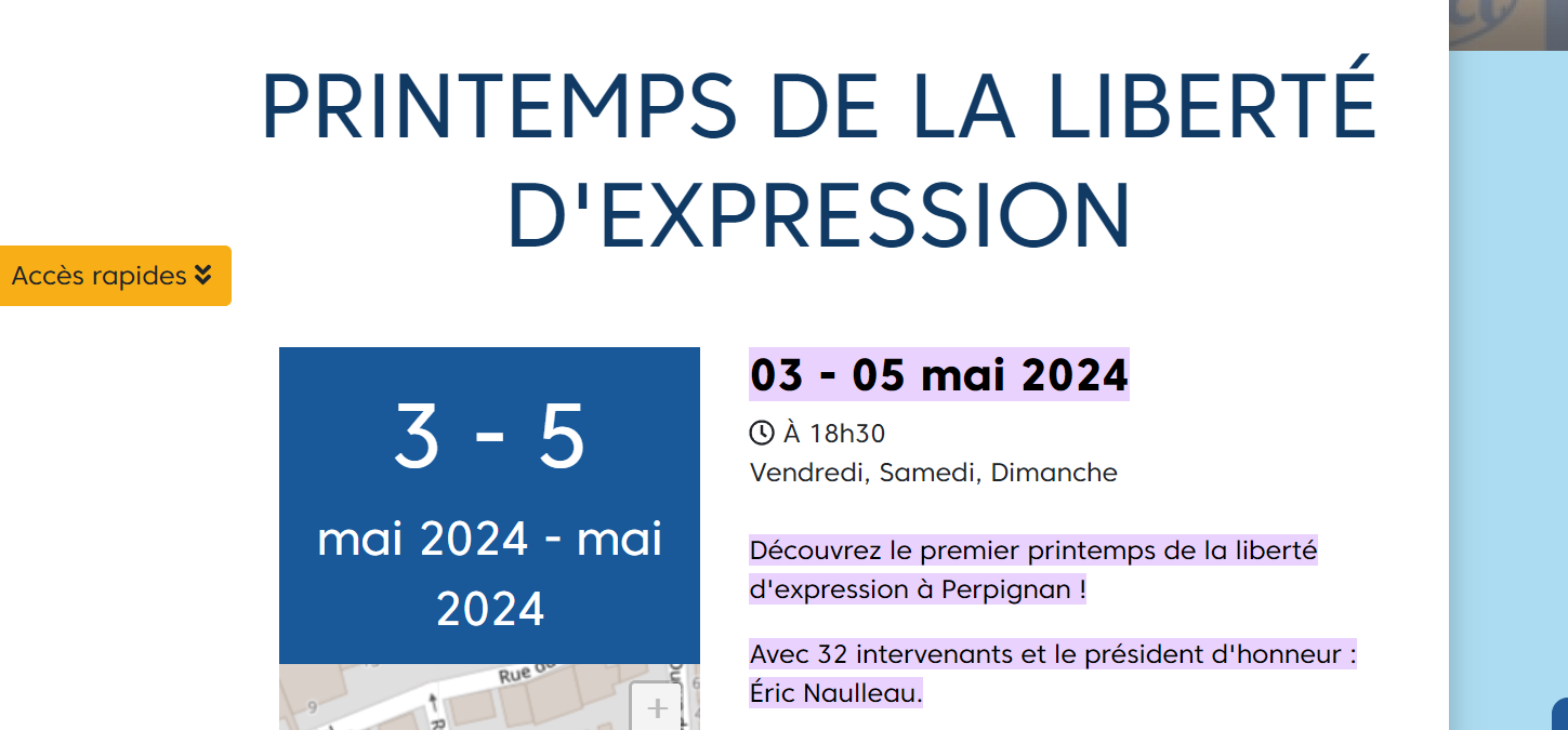 La ville de Perpignan (bien connue pour être le centre du monde) organise un printemps de la liberté d’expression, du 3 au 5 mai, au palais des congrès local. Nous soutenons cet événement…