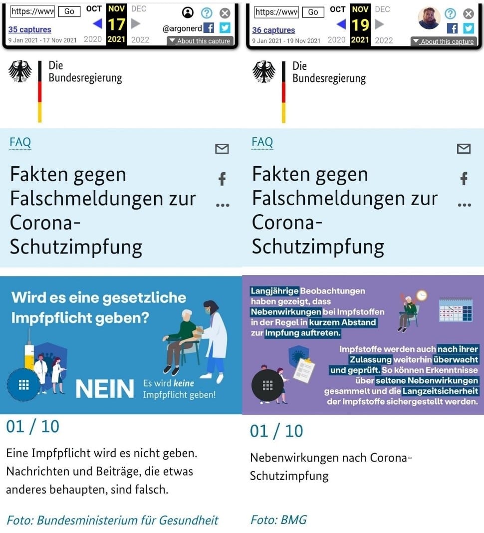 L’Allemagne, encore empêtrée dans un reste de respect des droits humains, ne peut se résoudre aujourd’hui à franchir le pas autrichien, celui de la vaccination obligatoire pour tous. L’on s’y prépare activement, cependant, et les sondages – évidemment favorables – comme les déclarations de responsables politiques – par exemple Daniel Günther, ministre président CDU du Schleswig-Holstein « j’y suis ouvert » ou encore l’inévitable Markus Söder, son homologue bavarois « c’est incontournable » – ou de personnalités des médias ou du monde du spectacle appuient en ce sens. Bien plus, le ministère fédéral de la Santé a fait disparaître, comme le montre la capture d’écran ci-dessous, de son site entre le 17 et le 19 novembre une FAQ affirmant : « il n’y aura pas d’obligation vaccinale. Les informations et contributions qui prétendent autre chose sont fausses. »