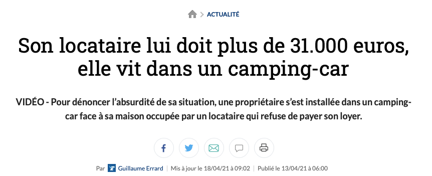 Un cas récent de locataire indélicat nous est relayé par Le Figaro. La propriétaire, qui est en cours de procédure, a choisi de s’installer dans un camping car devant sa propriété pour attirer l’attention.