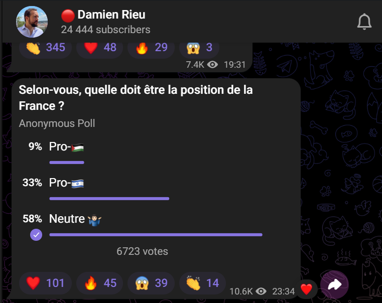 Officiellement, Eric Zemmour et Reconquête marchent comme un seul homme derrière Israël, malgré le « cordon sanitaire » dont le « Z » avait été victime au moment des élections présidentielles. On se souvient que Bernard-Henri Lévy avait accusé Zemmour de « piétiner le legs juif ». Pour Reconquête, l’affaire du Hamas est un combat de civilisation dans lequel la France ne doit pas se tromper. Méfiant, il préfère cependant envoyer Damien Rieu, ancien porte-parole de Génération Identitaire, au casse-pipe sur un sujet délicat. Arroseur arrosé, Damien Rieu vient de lancer un édifiant sondage, sur son fil Telegram (24.000 abonnés) à propos de la position française sur Israël. Le moins que l’on puisse est que l’outrance anti-palestinienne de Rieu est loin de faire l’unanimité dans son propre camp.