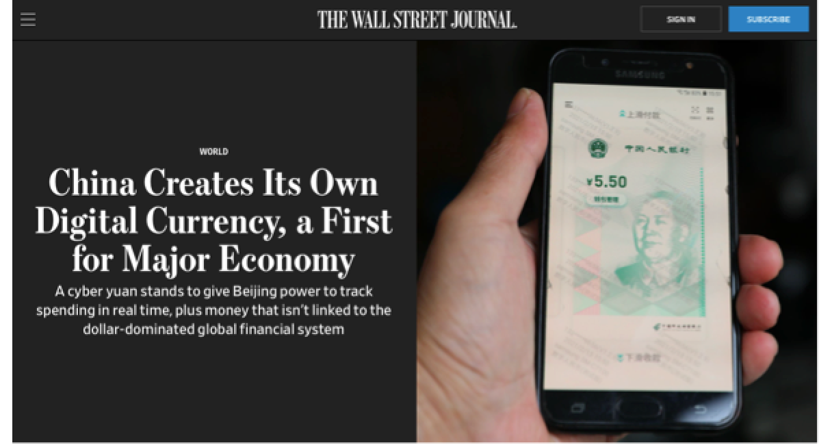 The Wall Street Journal a publié un article sur la mise en place du yuan numérique qui a déjà commencé en Chine.