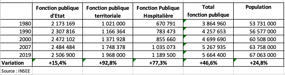 Au cours des quarante dernières années, les effectifs de la fonction publique ont augmenté près de 2 fois plus vite que la population de notre pays. Ceux de la fonction publique territoriale ont cru 4 fois plus vite, ceux de l’hôpital public 3 fois plus vite. L’INSEE et la DARES nous révèlent que cette progression inexorable a continué en 2019 et en 2020.