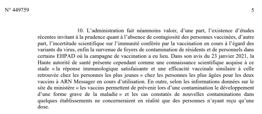 Nous reproduisons ici l’attendu numéro 10 de l’ordonnance, qui fait état de cette méfiance. Selon l’administration (de la Santé), des « études récentes » invitent à la « prudence » quant à l’absence de contagiosité des personnes vaccinées, et quant à « l’immunité conférée » par le vaccin. Cette prudence justifierait que les résidents d’EHPAD, même vaccinés, soient interdits de sortie : faire une promenade en famille risquerait de les exposer à la contagion, ou de favoriser des contaminations.