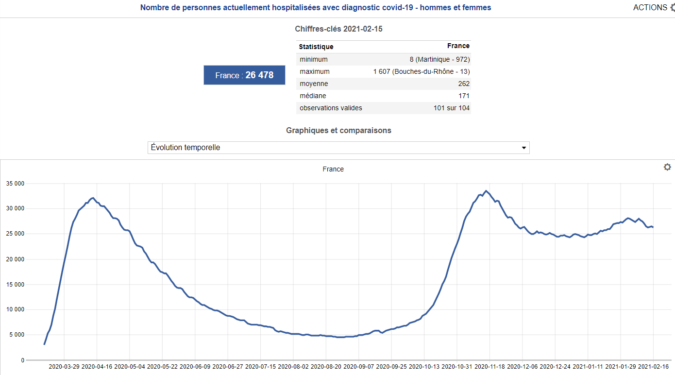 Comme le montre le graphique ci-dessus, le nombre des personnes hospitalisées qui a connu une légère reprise fin janvier et début février est en pleine décélération. Alors que l’arrivée de variants venus de monde entier était présentée (nous l’avons déjà évoqué) par de nombreux hiérarques médicaux comme une menace imminente pour la situation sanitaire du pays, l’épidémie se tasse sans que le gouvernement ne recourt au confinement.