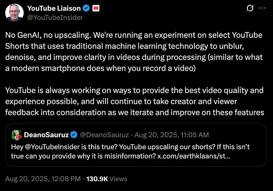 Après plusieurs semaines de rumeurs et de discussions sur Reddit, YouTube a fini par reconnaître l’existence de tests internes. René Ritchie, responsable des relations avec les créateurs, a confirmé que la plateforme avait recours à des techniques d’apprentissage automatique traditionnelles, destinées à réduire le bruit, améliorer la clarté et lisser l’image – un peu comme le fait déjà un smartphone lors de la capture d’une photo.