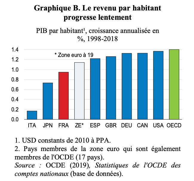 S’il fallait résumer l’Étude économique de la France par l’OCDE, deux graphiques suffiraient largement. Le premier figure ci-dessus. Il présente l’évolution du revenu net par habitant depuis 1998. Sa progression annuelle moyenne en France a été de moins de 1%, quand elle s’est approchée de 1,2% dans la zone euro, de 1,3% en Allemagne et de 1,4% dans l’OCDE.