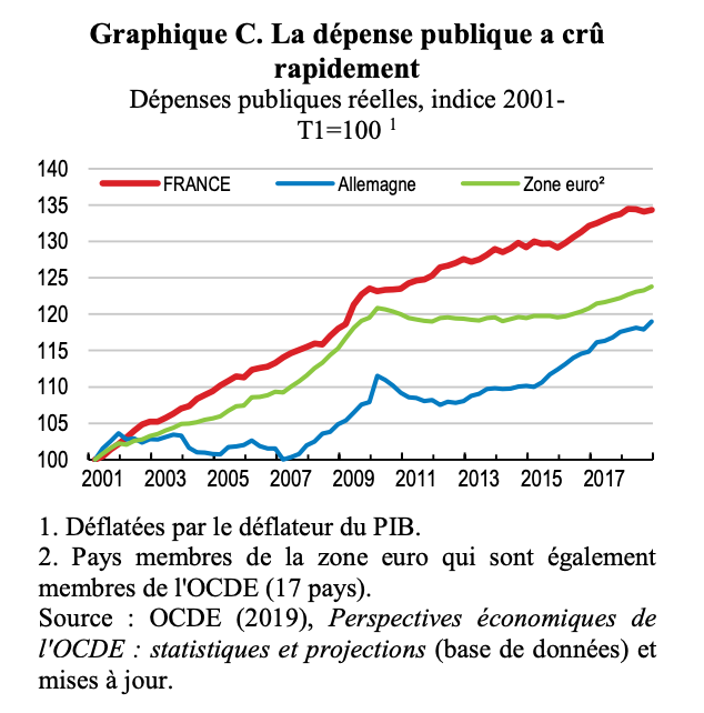 Le deuxième graphique présente la courbe d’augmentation de la dépense publique depuis 2001. Là encore la France bat des records… négatifs. Sur cette période, la dépense publique en France a crû de 25 points de plus qu’en Allemagne, et de 10 points de plus que dans la zone euro.