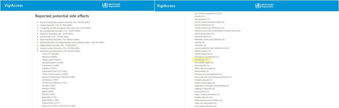 Les vaccins contre la COVID-19, administrés à une échelle mondiale sans précédent, ont entraîné une hausse importante des rapports d’effets secondaires sur des plateformes comme VigiAccess. VigiAccess « contient une base de données de tous les effets secondaires connus de tous les médicaments et vaccins approuvés pour un usage public« , et que « parmi les ‘effets secondaires possibles’ du vaccin Pfizer BioNTech contre la COVID-19, l’OMS répertorie la ‘variole du singe’, la ‘varicelle’ et la ‘variole de la vache’ parmi des centaines d’autres affections« .Selon l’OMS, VigiAccess recense « 5.761.262 rapports d’effets secondaires possibles« .