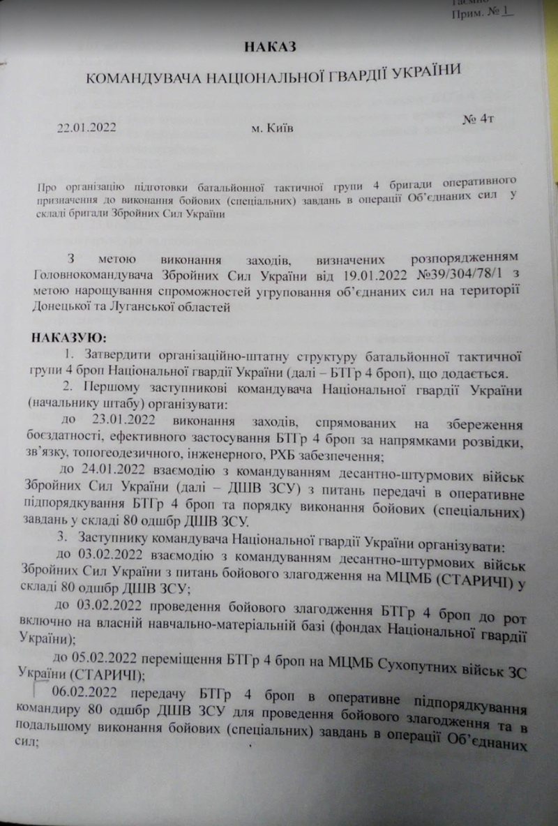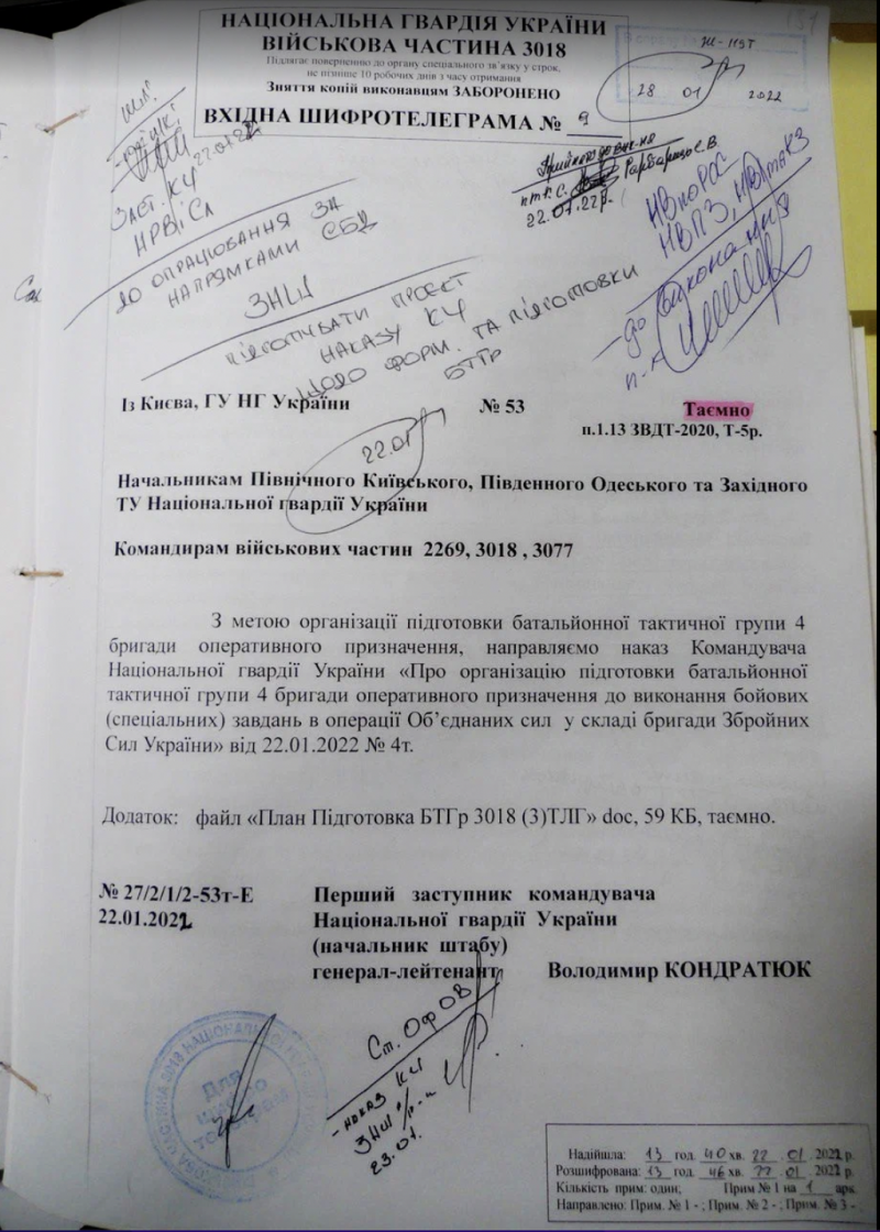 Selon M. Konashenkov, les documents en question mettraient en avant un ordre du commandant de la Garde nationale ukrainienne, le lieutenant- général Mykola Balan, qui datait du 22 janvier 2022.