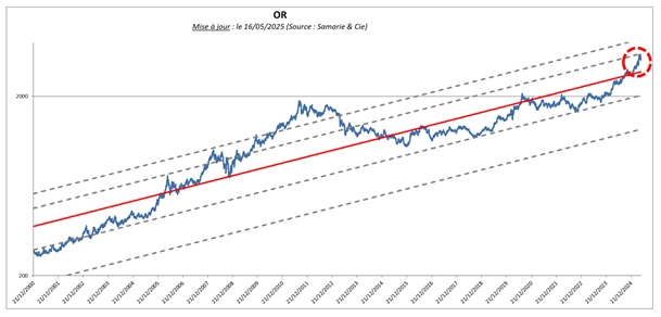 L’euro, nous vous l’avons expliqué ici, n’a pris 11% face au billet vert que pour des raisons techniques et conjoncturelles, à savoir la vente rapide d’actifs financiers américains par les investisseurs européens en réaction à la flambée de 50 centimes du taux long US sous l’effet des ventes de Treasuries(pour environ 70 Mds $)par des Chinois et des Japonais bien décidés à faire craquer Trump dans son bras de fer commercial et monétaire avec l’Asie. L’apaisement ayant vocation à se poursuivre entre Pékin et Washington, gageons que le dollar va gagner les 5 pts de % manquants face à l’euro (d’autant que la FED a maintenu son taux directeur dans une fourchette de 4,25à 4,5% lors de sa réunion du 7 mai 2025, marquant une 3èmeréunion consécutive sans changement)et donc le cours de l’or continuer à gentiment « latéraliser », le 10-ans US ne décrochant toujours pas des 4,5% atteints en pleine tempête, ce qui en refait un sérieux concurrent de l’or.
