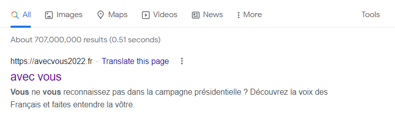 Macron sera-t-il le candidat anti-système ? C’est ce que laisse entendre le « pitch » de son site Internet de campagne, « Avec vous 2022 », dont nous reproduisons ci-dessous la présentation telle qu’elle apparaît sur Google. On y découvre que le « positionnement » marketing du produit Macron est celui de l’anti-système : il s’adresse à ceux qui ne se reconnaissent pas dans la campagne présidentielle, et propose, comme un candidat de la société civile, aux Français de faire entendre leur voix. On reconnaît ici la patte sans vergogne de Mc Kinsey et consors, qui suivent des lignes marketing en dépit du bon sens et des meilleures évidences.
