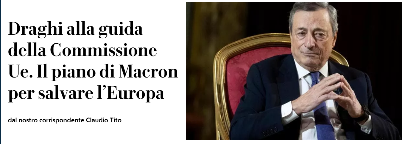 L’information vient de la presse italienne (en l’espèce le journal social-démocrate La Reppublica) : Emmanuel Macron pousse la candidature de Mario Draghi à la tête de la Commission Européenne pour succéder à Ursula von der Leyen, qui passerait au secrétariat général de l’OTAN. Et, comme un fait exprès, Mario Draghi a déclaré il y a quelques jours que l’Union Européenne devrait se transformer en Etat. La bataille pour l’avenir de l’Europe, c’est maintenant. Et l’énergie de chacun sera indispensable pour mettre en échec le projet mondialiste.