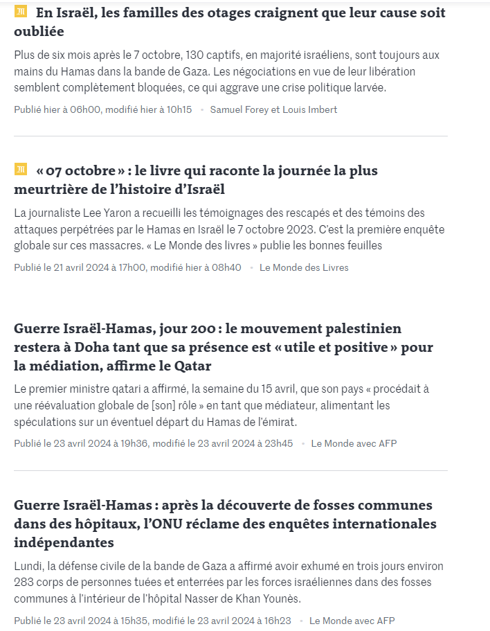 Dans le narratif néo-conservateur que le cartel français des médias subventionnés colporte scrupuleusement et servilement, Israël est le camp de bien et de la démocratie, contre les Palestiniens, islamisés par le Hamas et donc grands méchants terroristes. Le problème tient évidemment au fait que les exactions scandaleuses commises quotidiennement par l’armée israélienne à Gaza et en Cisjordanie occupée (en violation du droit international, rappelons-le, puisque la presse subventionnée oublié systématiquement de le mentionner) invalident cette farce d’un combat du bien contre le mal. Pour maintenir l’illusion voici comment l’immonde donneur de leçons pharisiennes Le Monde s’y prend.