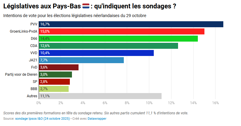 Les élections anticipées du 29 octobre se déroulent dans un climat d’incertitude totale. Les sondages placent cinq partis dans un mouchoir de poche, chacun oscillant entre 10 % et 17 % d’intentions de vote. Le PVV demeure puissant, mais isolé : toutes les formations majeures, y compris le VVD, refusent catégoriquement de gouverner avec Wilders.