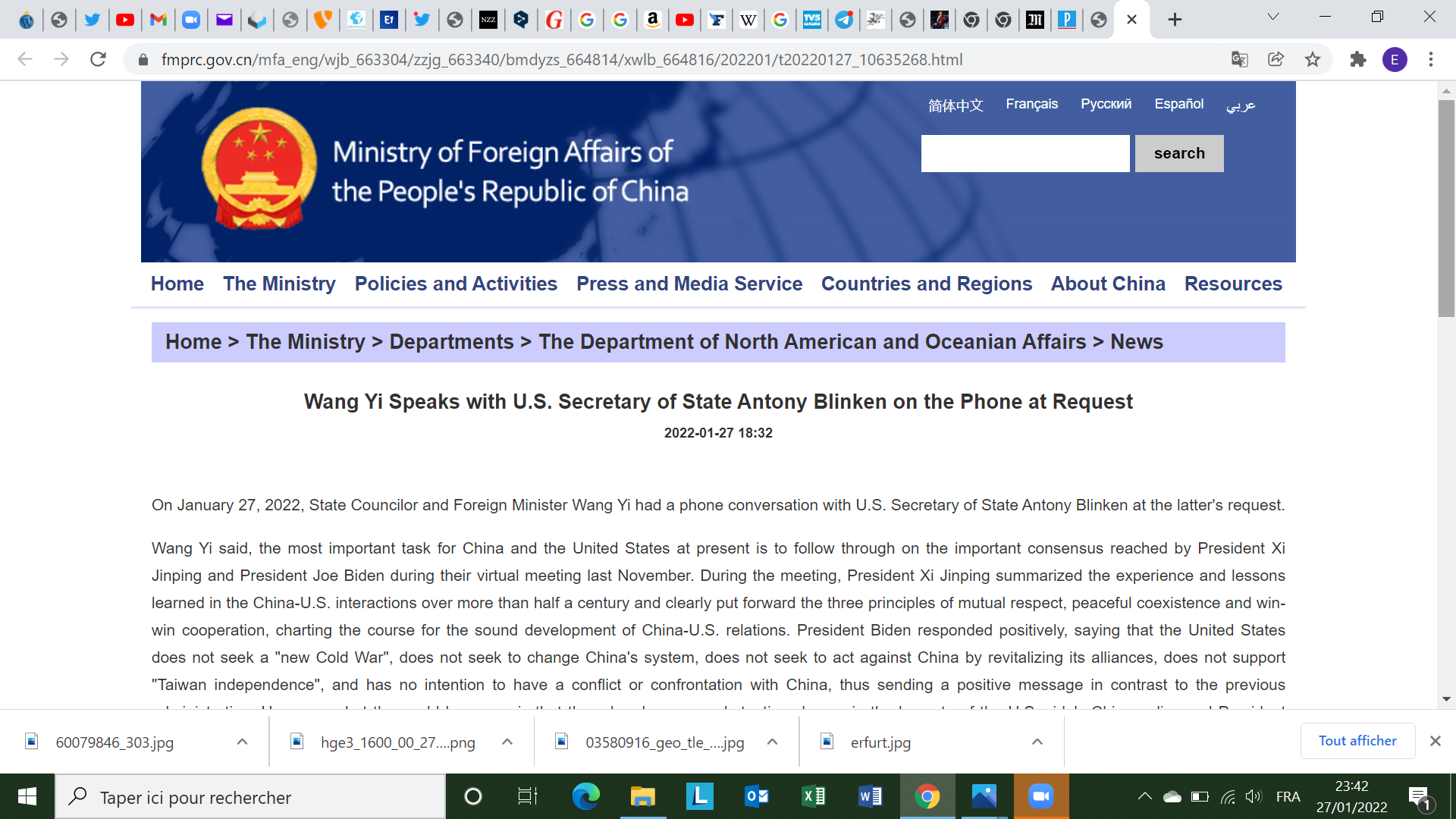 Le communiqué officiel du Ministère chinois des Affaires étrangères est très clair: lors de l’entretien téléphonique qu’ils ont eu ensemble jeudi 27 janvier « M. Blinken a informé Wang Yi de la position américaine sur la question ukrainienne, entre autres. Wang Yi a déclaré que, pour résoudre la question ukrainienne, il est toujours nécessaire de revenir au nouvel accord de Minsk. Le nouvel accord de Minsk, approuvé par le Conseil de sécurité des Nations unies, est un document politique fondamental reconnu par toutes les parties et doit être mis en œuvre avec sérieux. La Chine soutiendra tout effort conforme à la direction et à l’esprit de cet accord. Dans le même temps, nous appelons toutes les parties à rester calmes et à s’abstenir d’attiser les tensions ou d’exacerber la crise. Wang Yi a souligné que la sécurité d’un pays ne devait pas se faire au détriment de la sécurité des autres, et que la sécurité régionale ne devait pas être garantie par le renforcement, voire l’expansion, des blocs militaires. Aujourd’hui, au XXIe siècle, toutes les parties devraient abandonner complètement la mentalité de la guerre froide et former un mécanisme de sécurité européen équilibré, efficace et durable par le biais de négociations, les préoccupations légitimes de la Russie en matière de sécurité étant prises au sérieux et traitées ».