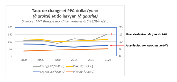 En effet, comme l’illustre le graphique ci-dessus, les signes s’accumulent d’un entêtement des Asiatiques (Chinois et Japonais) à sous-évaluer leurs devises (respectivement lerenminbi ou yuan, de plus de 40% par rapport à sa parité de pouvoir d’achat, PPA, en dollar et le yen, de plus de 30% par rapport à sa PPA en dollar) pour gagner en compétitivité, manœuvre éminemment dangereuse pour la stabilité du SMI, mais qui ressemble furieusement, à certains égards, au « bancor » avorté du plan Keynes présenté lors du Sommet de Bretton Woods en juillet 1944 et déjà ressorti des cartons en 2008 par le gouverneur de la Banque Populaire de Chine, Zhou Xiaochuan…