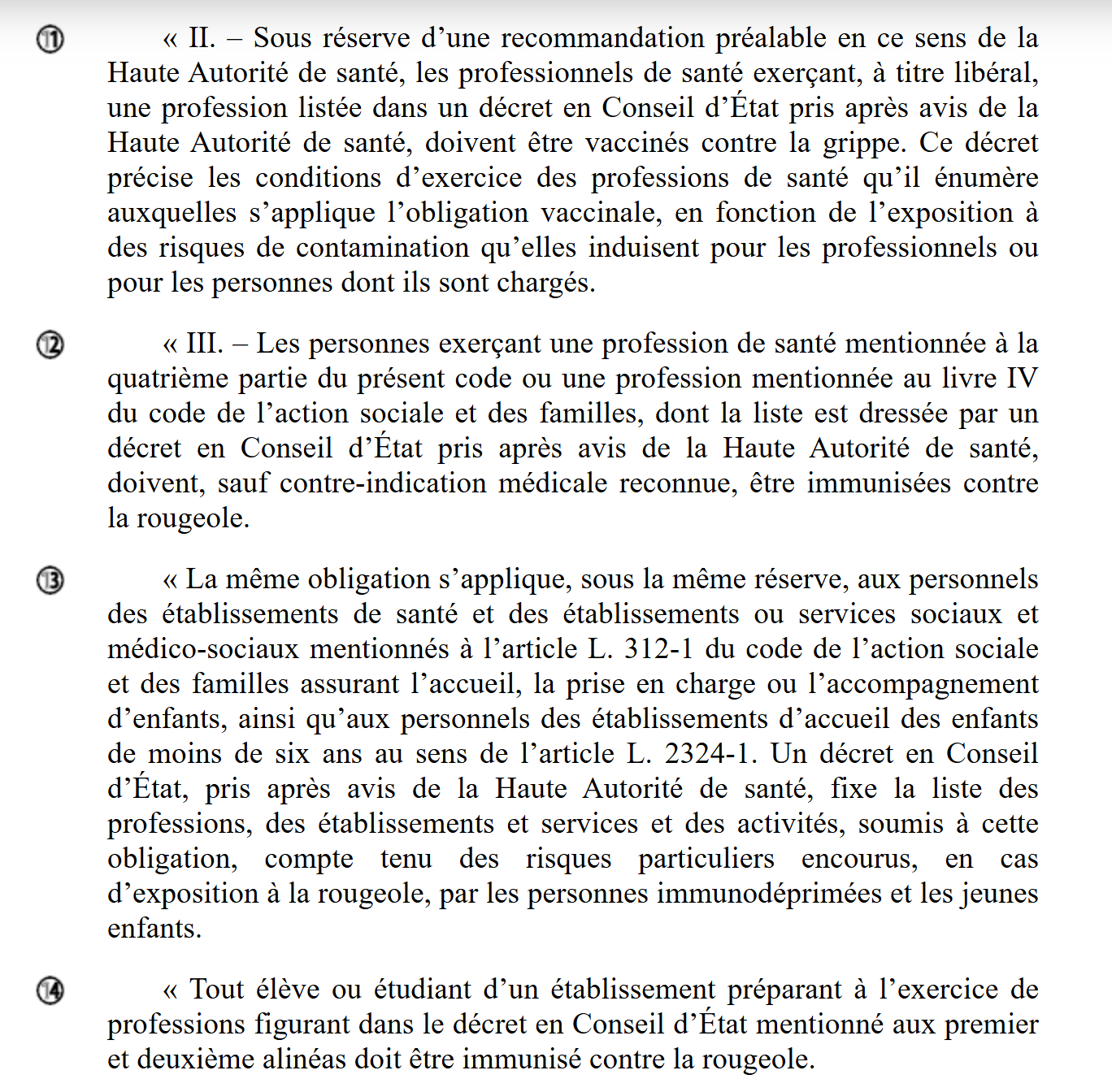 - Neutralité technologique : le texte impose une obligation d'immunisation contre une maladie ("contre la grippe", "immunisées contre la rougeole"), mais ne mentionne aucune technologie vaccinale spécifique (ARNm, virus inactivé, vivant atténué, etc.).