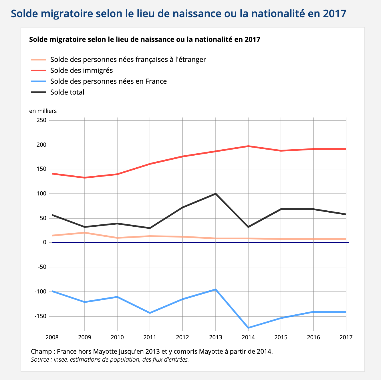 Le graphique ci-dessus dresse le (sombre mais implacable) tableau du solde migratoire français. Chaque année, la France compte officiellement près de 200.000 immigrés de plus.