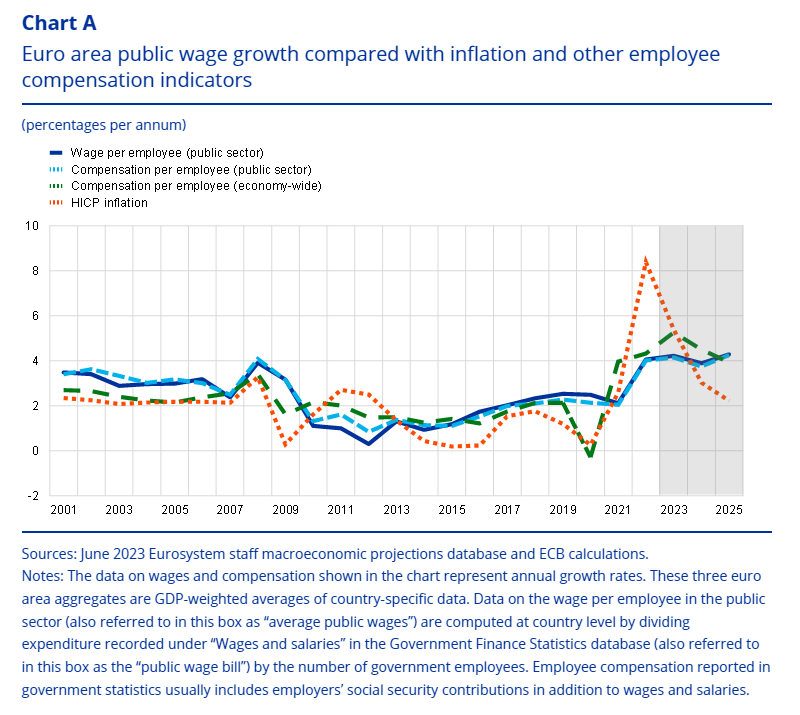 Alors que les Echos s’inquiètent ce matin de la baisse de consommation alimentaire en France consécutive à la montée de l’inflation, la Banque Centrale Européenne publie une étude qui constitue une véritable mauvaise nouvelle pour les consommateurs, même s’ils croient le contraire : les salaires dans la fonction publique, dans la zone euro, devraient donner le signal d’une spirale infernale déjà commencée en France l’an dernier, celle de la hausse des salaires qui nourrit l’inflation, qui pousse à la hausse des salaires. Ces mouvements salariaux laissent à penser que l’inflation sous-jacente est partie pour durer…
