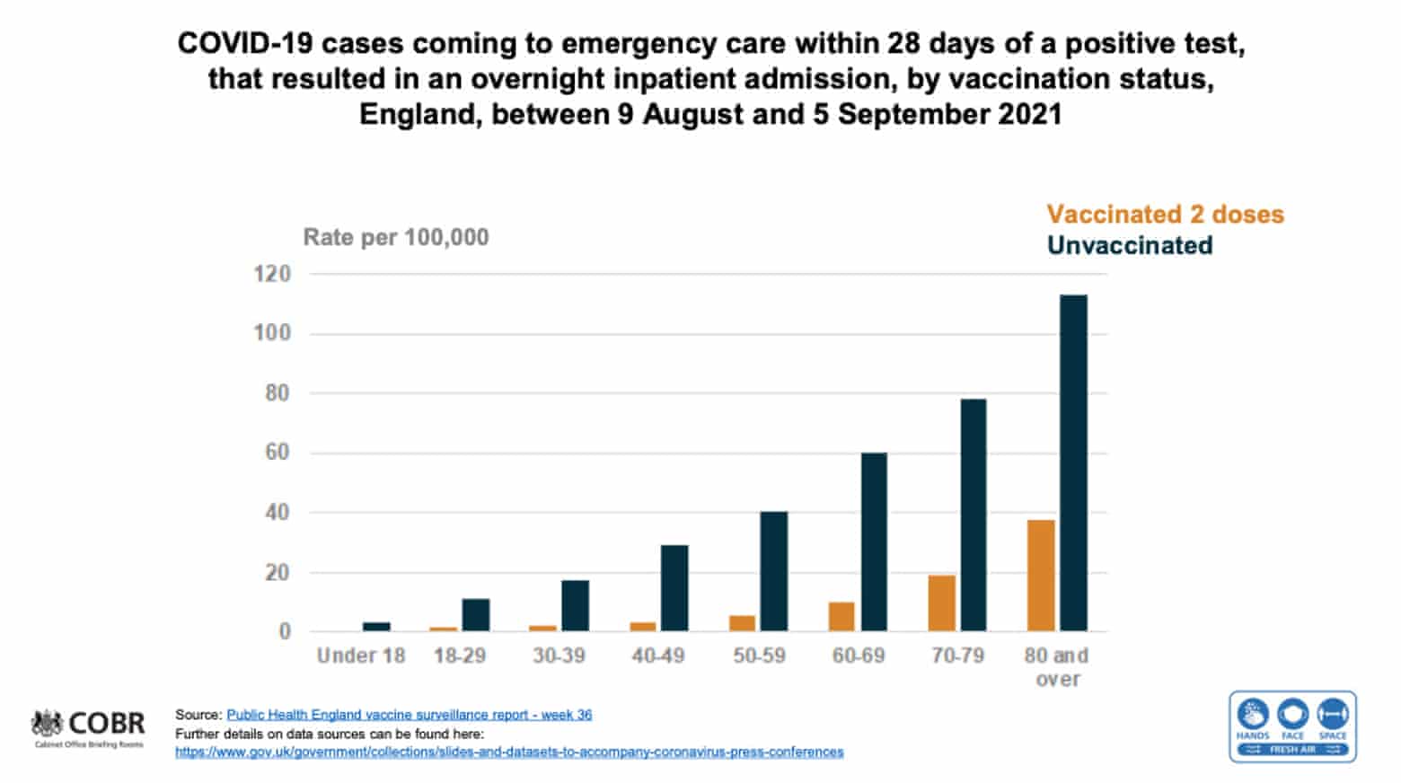 Bien entendu, on peut avoir une lecture cynique du comportement de Johnson, que l’on constaterait simplement meilleur psychologue que notre psychorigide président. Cependant, le Premier ministre a laissé le Professeur Whitty présenter des slides. Les journalistes présents et ceux qui suivaient la conférence de presse à distance ont pu faire des captures d’écran. A la différence des chiffres sortis du chapeau d’Emmanuel Macron, les données avancées par Downing Street pourront être réfutées. Je donne l’exemple de la slide qui montre quand même plus de non-vaccinés que de vaccinés parmi les gens hospitalisés en urgence pour Covid:
