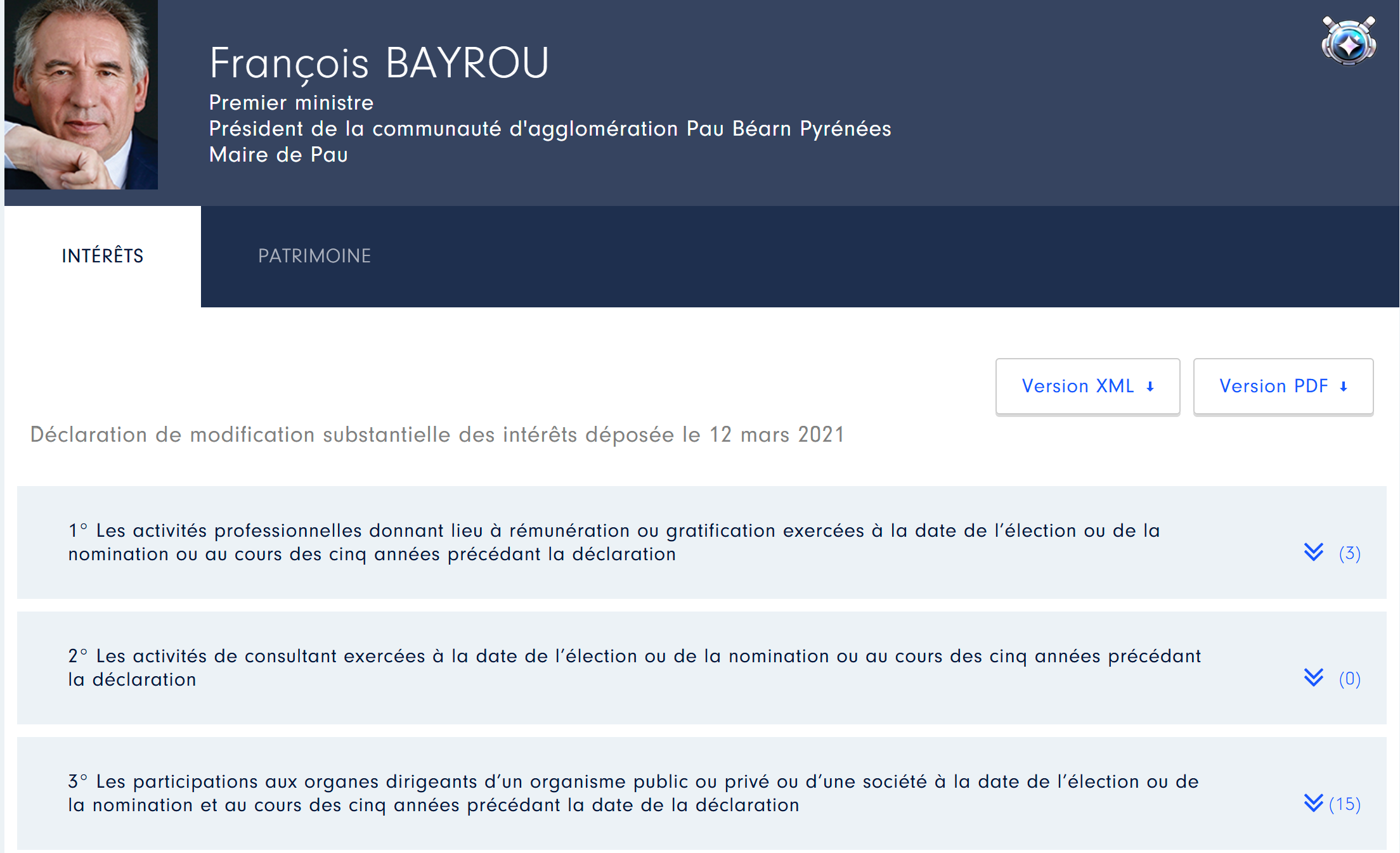 Donc, comme l’indique notre capture d’écran ci-dessus, la dernière déclaration d’intérêts publiée par François Bayrou date de… 2021. Depuis, plus rien… Il en va de même pour les autres ministres du gouvernement : les Français doivent rendre compte chaque année au gouvernement de leurs revenus et de leur patrimoine, mais eux-mêmes ne sont pas redevables au peuple.