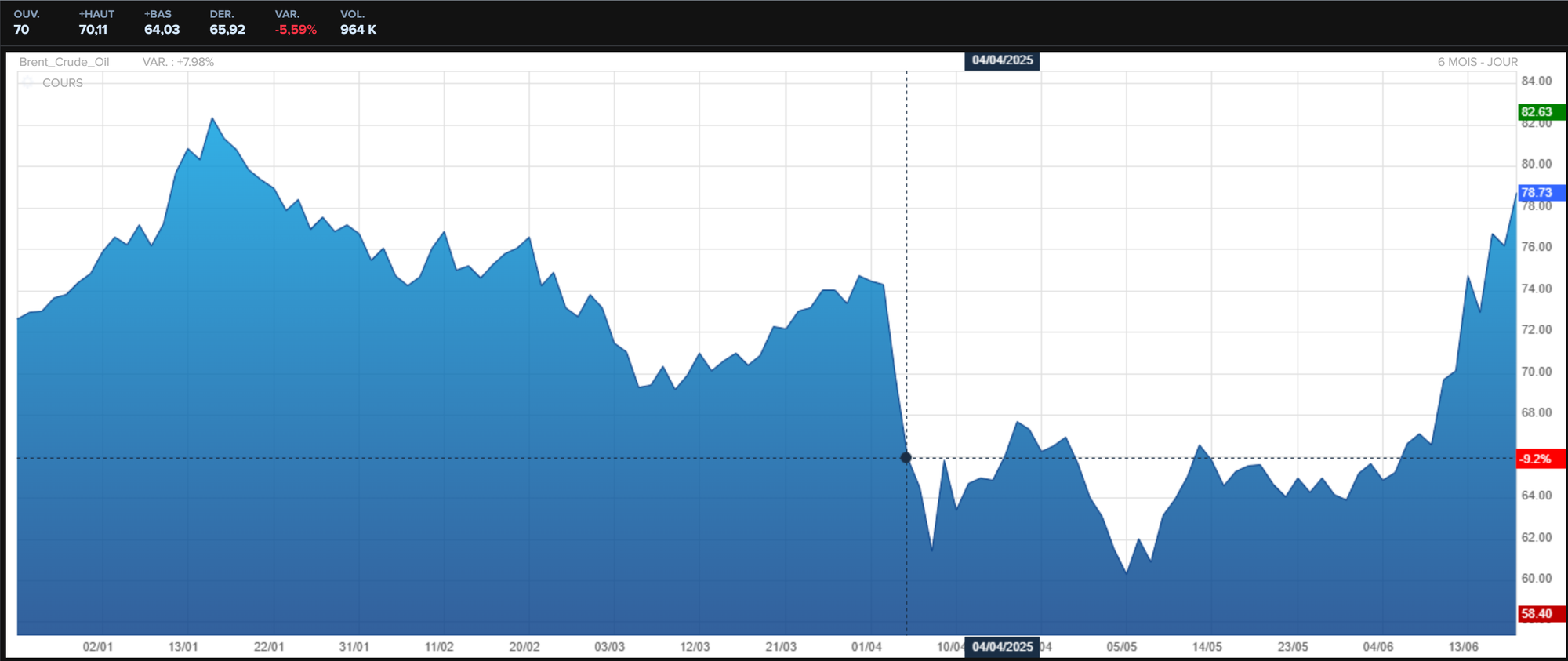On le sait, le cours du pétrole brut (le Brent…) est très sensible à des influences extérieures, et particulièrement aux crises géopolitiques. Ses fluctuations donnent une bonne indication sur l’état d’angoisse des marchés. Assez curieusement, depuis le début de la crise israélo-iranienne, les cours sont restés plutôt stables, même s’ils ont pris 2% en 24h. Jusqu’où peuvent-il monter ? A partir de quand faut-il voir un signal d’alerte ?