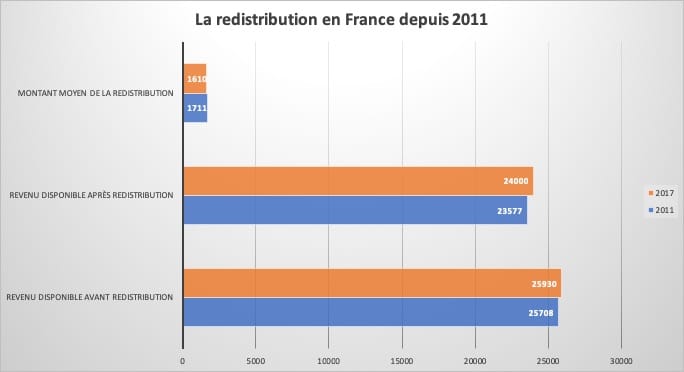 Chaque année, les prélèvements publics permettent de redistribuer un montant moyen de prestations analysé par l’INSEE. Ce montant est passé 1.711€ en 2011 à 1.610€ en 2017. Autrement dit, la redistribution a baissé en volume d’environ 5%. Rapportée au revenu moyen global, la redistribution écrêtait 8,3% des richesses en 2011, et seulement 7,4% en 2017. L’intensité de la redistribution a donc diminué en 8 ans. Nous verrons ci-dessous l’effet réel produit par ce phénomène pour les plus défavorisés, pour qui la situation est relativement contradictoire.