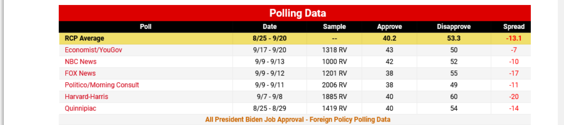 Selon le média en ligne « Real Clear Politics » , la moyenne des sondages US montrait hier que seuls, 40% des citoyens US soutiennent la politique étrangère de leur