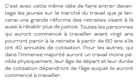 Comme Macron, elle propose un dispositif spécial pour les accrières dites longues, avec un âge préférentiel de départ à la retraite. Pour les autres, elle ouvre la possibilité de partir à 62 ans, semble-t-il, mais avec des décotes, c’est-à-dire des minorations de la retraite.