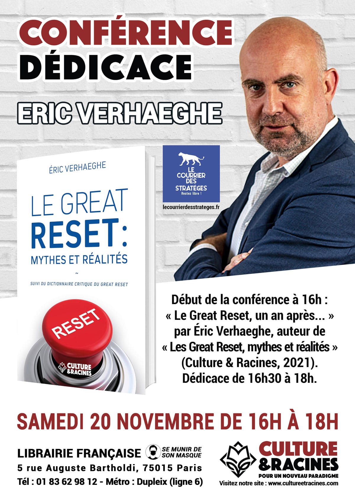 Enfin, pour les amateurs du genre, je donnerai une conférence courte sur l’actualité du Great Reset samedi à 16h à Paris, suivie d’une séance de dédicace.