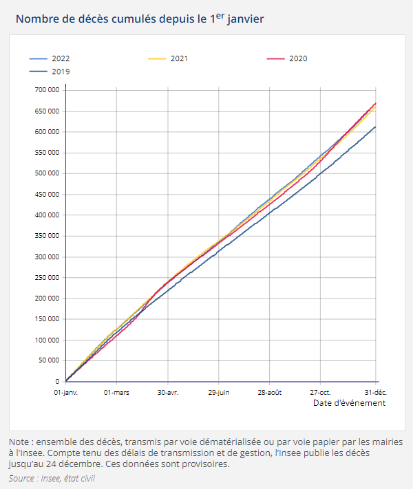 La publication par l’INSEE des chiffres de la mortalité en 2022 est quasiment passée inaperçue la semaine dernière. Elle pose pourtant de sacrées questions… trop embarrassantes sans doute pour le cartel de la presse subventionnée, qui s’est nourri de la peur éhontée du COVID pendant 3 ans, et a servilement proposé une soupe sans nuance sur les bienfaits prétendus du vaccin, sans jamais s’interroger sur les mensonges évidents de l’industrie pharmaceutique. Donc, alors que le vaccin devait nous sauver d’une mort quasi-certaine, on s’aperçoit qu’il n’en a rien été. En 2022, la mortalité a augmenté par rapport à 2021… année où la mortalité n’a guère baissé de façon fulgurante par rapport à 2020 où le COVID a prélevé son tribut chez nos anciens les plus fragiles. L’INSEE se garde bien d’expliquer le phénomène… mais tout le monde comprend que le vaccin a tué au lieu de sauver.