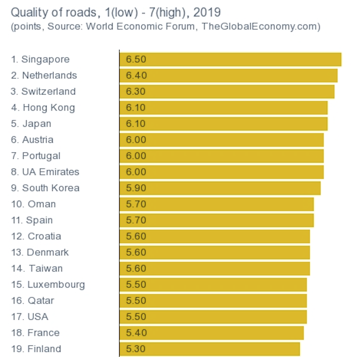 En tous cas, notre « pognon » n’est pas mis dans les routes. En quinze ans, la France a sombré de la deuxième à la dix-huitième place, comme le montre www.theglobaleconomy.com/rankings/roads_quality qui collecte des données sur 141 pays.