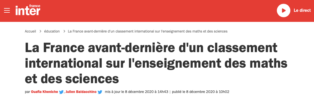 Concernant l’école, bien que le budget de l’Éducation nationale absorbe 96 € sur 1 000 € de dépenses publiques, la position de la France dans les divers classements ne cesse de chuter. Que ce soit le classement généraliste PISA (dernier en date publié en 2019) ou le classement plus orienté sciences TIMMS, les résultats se ressemblent et sont affligeants. Malgré son système éducatif monopolistique et coûteux, la France ne figure pas au tableau d’honneur et serait même dans les cancres.