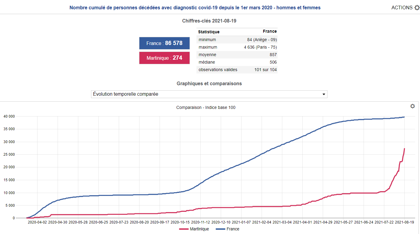 Sur les décès, il est un fait que la Martinique se situe à un niveau encore très inférieur à la moyenne métropolitaine. On retiendra néanmoins que l’épidémie aurait tué 150 personnes au mois d’août, ce qui est un chiffre important pour l’île.