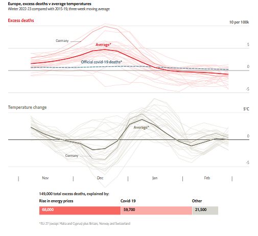 D’après The Economist, bulletin paroissial de Davos, au cours de l’hiver dernier, le froid imposé par la cherté énergétique imposée par les « sanctions » aurait tué « plus d’européens que le Covid ».