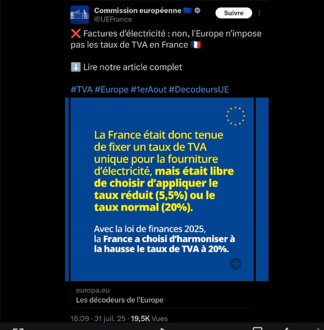 Le 1ᵉʳ août, pendant que nombre de Français profitaient de leurs vacances, une mesure inattendue est entrée en vigueur : l’augmentation de la TVA sur les abonnements au gaz et à l’électricité, passant de 5,5 % à 20 %. Les causes de cette nouvelle taxation sont vite devenues une source de débat. Selon les rumeurs, il s’agit d’une obligation de l’Union européenne. Est-ce vrai ?