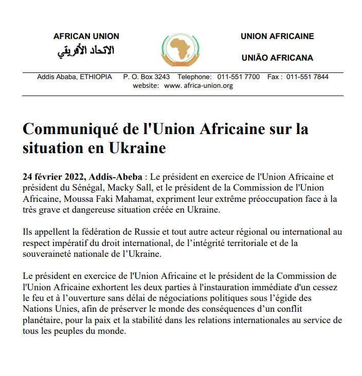 Le 24 février, l’Union Africaine avait appelé la Russie à respecter le droit international.