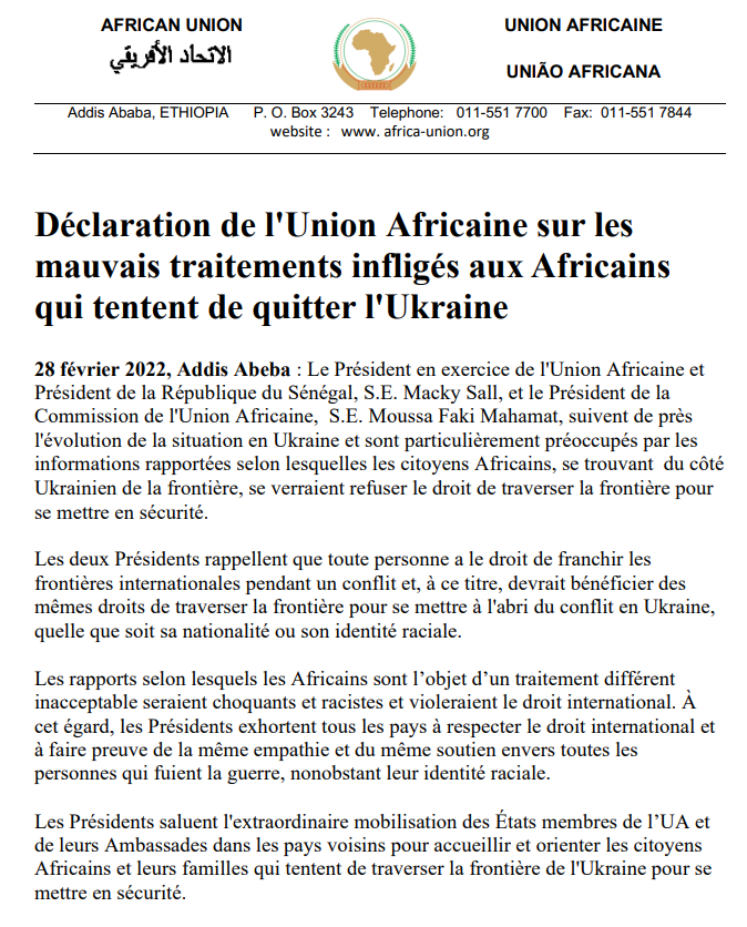 A noter également que depuis le continent Africain, les mauvais traitements réservés à leurs ressortissants en Ukraine ont particulièrement choqué.