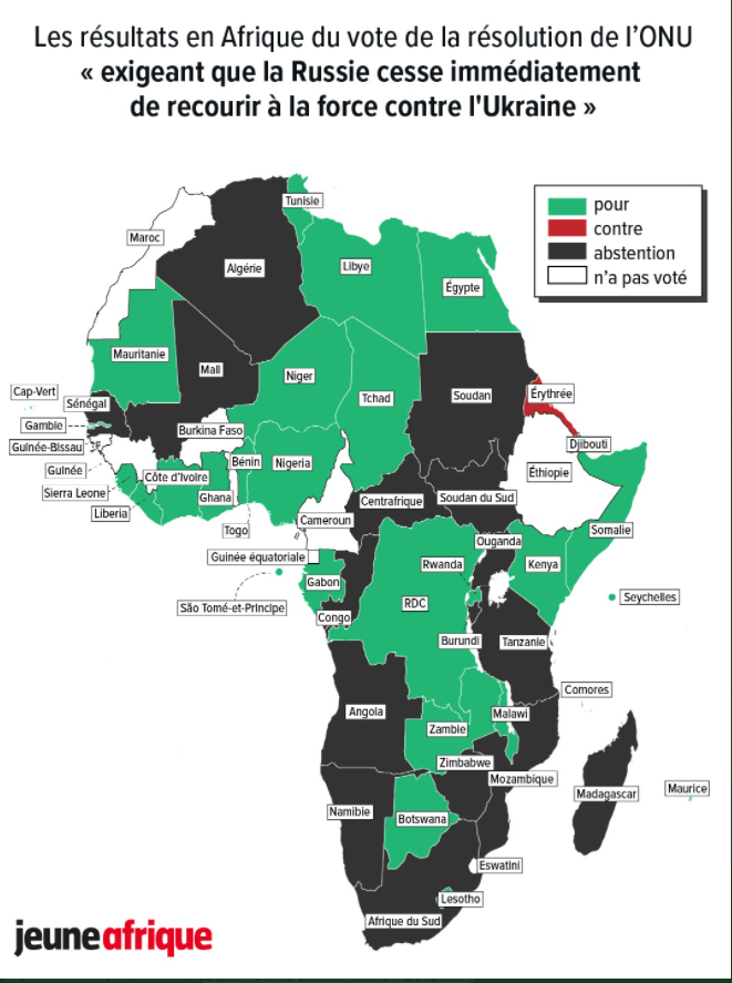 En tout état de cause, ce vote réaffirme la volonté de non-alignement des pays africains, quel qu’en soit la raison. Il démontre également le basculement de plusieurs piliers de la zone d’influence de l’UE (et de la France plus particulièrement) en faveur de la Russie.