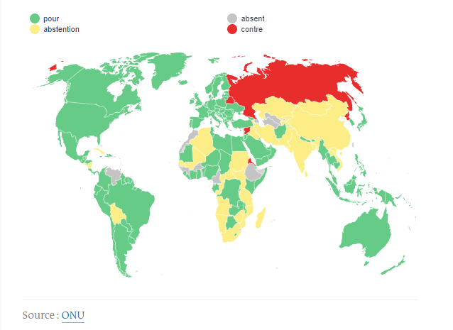 Le texte a été adopté par 141 votes pour, 5 votes contre (Russie, Bélarus, Erythrée, Corée du Nord et Syrie) et 35 abstentions. La résolution, qui était coparrainée par 96 Etats membres, nécessitait une majorité des deux tiers pour être adoptée. Elle n’est pas contraignante.