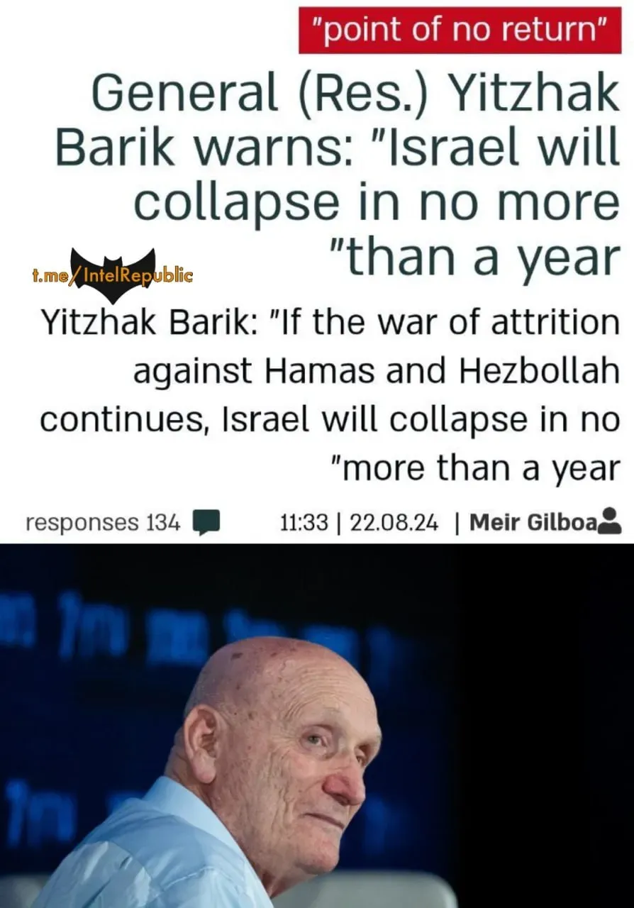 Le Général Barik a l’âge de l’Etat d’Israël. Il est respecté pour sa bravoure au combat, en particulier pendant la Guerre de Kippour. Il vient de publier dans Haaretz un véritable brûlot. Le gouvernement ne cesse de mentir à la société israélienne, explique-t-il. Tsahal est incapable de vaincre le Hamas. Le gouvernement Netanyahu a laissé passé l’occasion d’un accord. Il s’enfonce dans une guerre d’usure, qui se déroule à son détriment, et que le Hezbollah et l’Iran sauront exploiter. Et ceci d’autant plus que l’économie s’effondre et la société se divise. Barik lâche la formule choc: si Netanyahu reste, le pays s’écroulera dans l’année qui vient. Nous avons jugé important de porter ce texte, sans filtre, à la connaissance des lecteurs du Courrier des Stratèges.