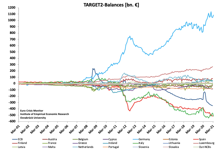 L’euro étant une union monétaire décentralisée, les banques centrales nationales existent toujours et tiennent des bilans séparés. La comptabilité entre banques centrales nationales porte le nom de Target2. Il s’agit d’échanges qui ne sont pas soldés, d’échanges à crédit donc, entre pays de l’Eurozone.