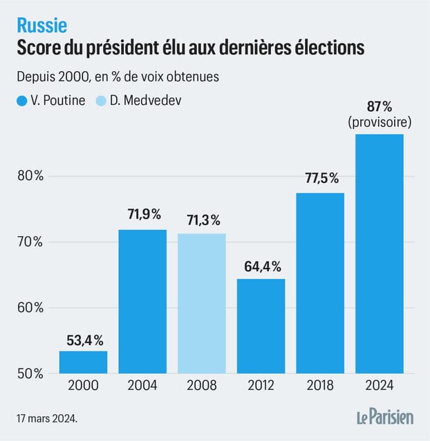 Vladimir Poutine a été réélu président de la Fédération de Russie par deux électeurs inscrits sur trois. Il a obtenu en effet 87% de 77% de votants. C’est de loin le meilleur score qu’il ait obtenu, avec une participation en hausse. En Occident, beaucoup crient à l’insincérité du scrutin. Mais de deux choses l’une: soit Nord-Américains et Européens de Bruxelles avaient sous-estimé l’emprise du pouvoir poutinien sur la société russe; soit les gouvernants occidentaux se sont trompés sur la société russe. Dans les deux cas, l’objectif principal de la prolongation de la Guerre d’Ukraine, en mars 2022, malgré l’envie de paix de Zelensky – à savoir renverser Vladimir Poutine – a lamentablement échoué. Ce ne sont pas seulement les Ukrainiens, ce sont les peuples d’Europe, embarqués dans une guerre qui n’est pas la leur par l’oligarchie occidentale, qui demandent des comptes.